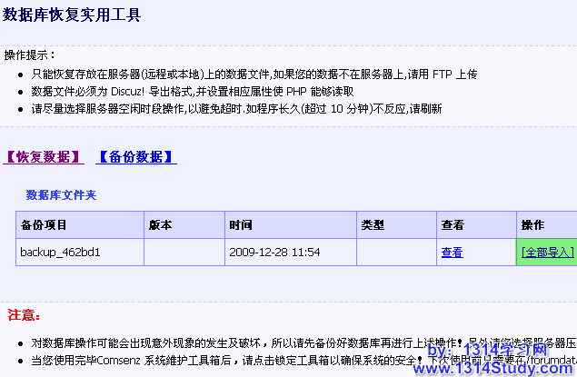 此功能可以一次性导入 Discuz!7.2 产品备份的数据库,前提是您已经做过数据备份。