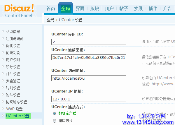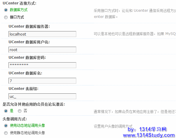 UCenter 连接方式:请根据您的服务器网络环境选择适当的连接方式。如果您的 UCenter 和 Discuz! 在同一台服务器则可以选择数据库方式,同时会看到上图中的设置项目;