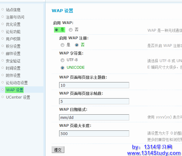 4、可以设置 WAP 的帖子列表页面每页显示的主题条数。