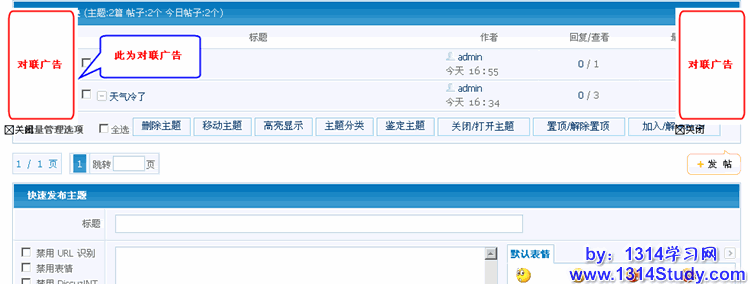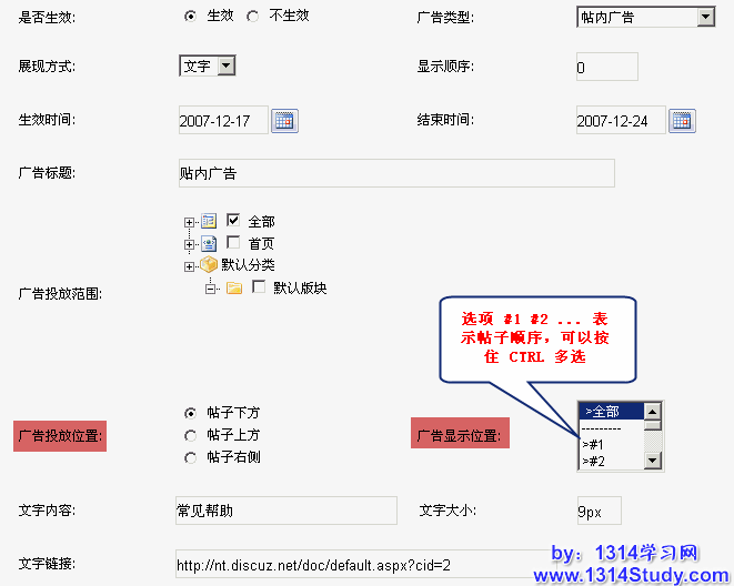 与头部横幅广告不同的是,这里有三种广告投放位置,广告显示位置可以在每个贴子的下方 上方 右侧显示,也可以自已定义在第几个贴子的下方 上方 右侧显示。