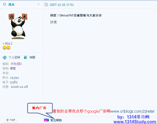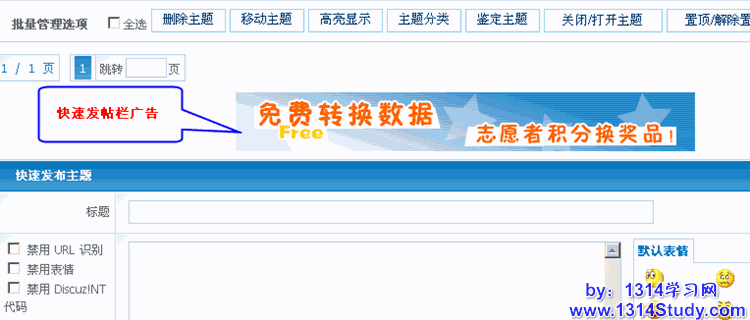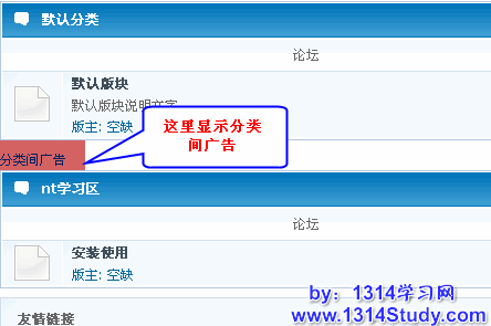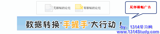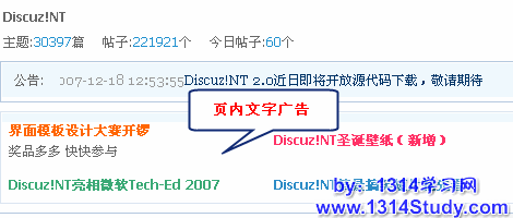 页内文字广告以表格的形式,显示于首页、主题列表和帖子内容三个页面的中上方,通常使用文字的形式,也可使用小图片和 Flash。