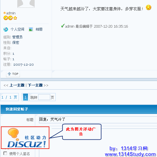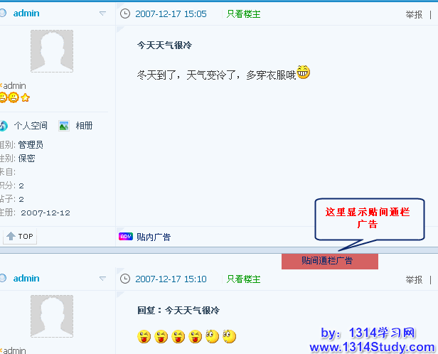 帖间通栏广告显示于楼主和2楼帖子之间, 通常使用 728*90 图片或 Flash 的形式。