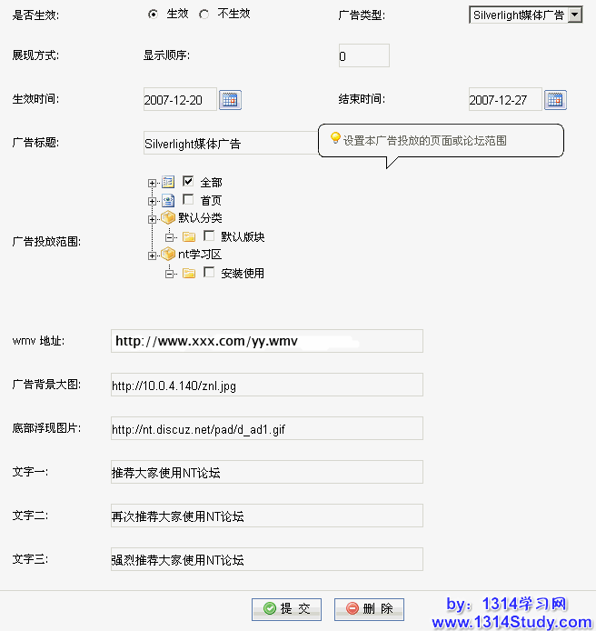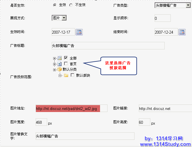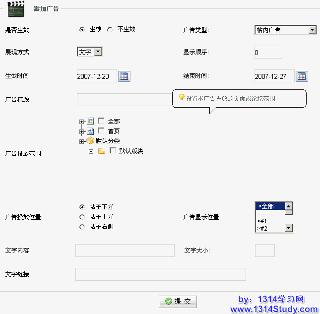 广告投放范围:设置本广告投放的页面或论坛范围。
