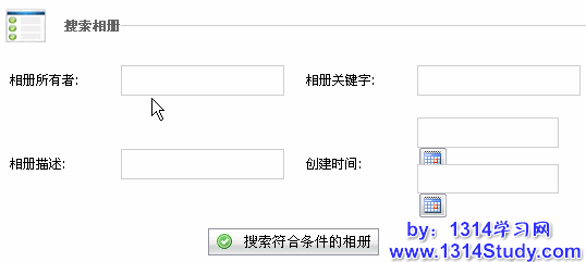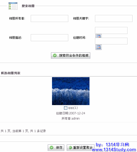 这是一个推荐相册的全图界面。首先,你需要根据条件搜索到你要推荐到首页的相册,这些条件包括相册作者、相册关键字、相册描述和创建时间。如下图所示:
