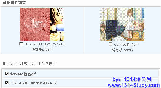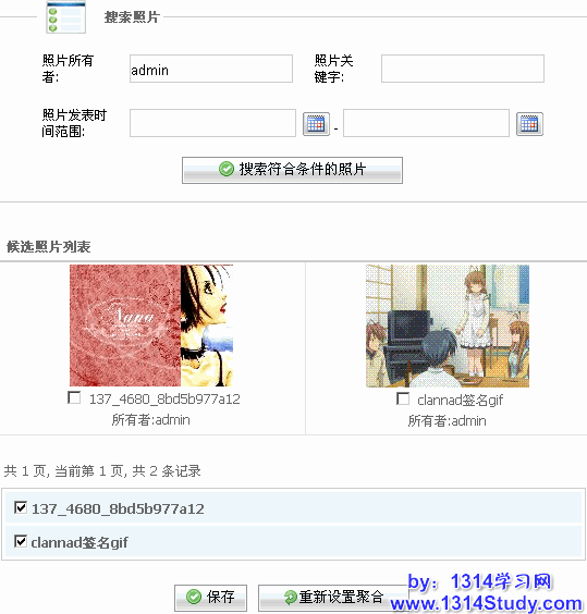 这里可以通过设置照片所有者、照片关键字(即对照片标题进行模糊检索)和照片发布时间范围等条件作为搜索范围进行查找。点击“搜索符合条件的照片”按钮后,符合条件的照片将列在“候选照片列表”里面。