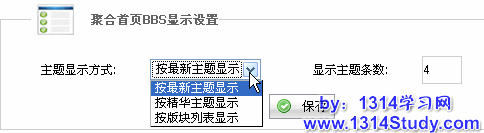 首先,你需要配置一下聚合首页 BBS 显示设置的数据,包括主题的显示方式,目前的版本支持按最新主题显示、按精华主题显示、按版块列表显示,同时你也可以设置聚合首先显示,如下图所示: