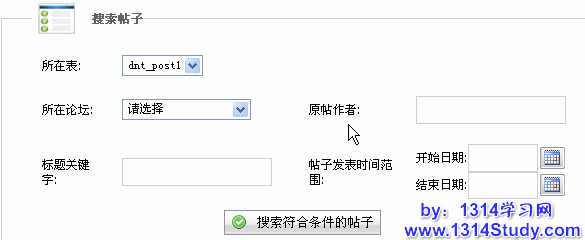 设置好之后,你现在得搜索需要置顶的帖子了。由于 Discuz!NT 是支持帖子表分表的,所以你得设置一下帖子的所在表。下面的这些条件都是来限制搜索范围的,包括设置帖子所在论坛、原帖作者、标题关键字,还有就是帖子的发表时间范围,如下图所示: