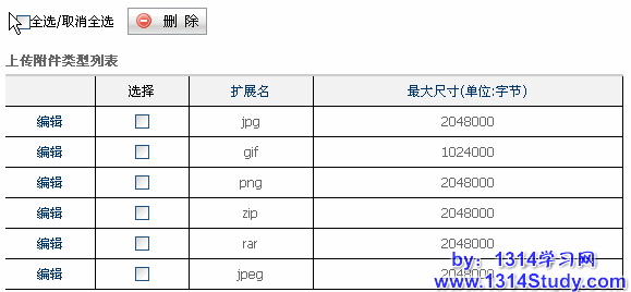 添加完毕后我们可以在上传附件类型列表中看到刚才添加的附件类型,这样,用户上传的此类后缀的附件就后受到这里设置的大小限制。如下图所示: