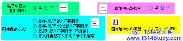 1、帖子中显示图片附件:在此设置是否在帖子中直接将图片或动画附件显示出来, 而不需要点击附件链接。选择否,帖子中不显示附件图片。