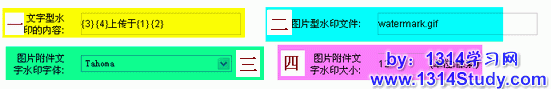 1、文字型水印的内容:在此设置文字水印的内容,可以使用替换变量::{1}表示论坛标题 {2}表示论坛地址 {3}表示当前日期 {4}表示当前时间。例如:{3} {4}上传于{1} {2},是指*年*月*日*时上传于*论坛。