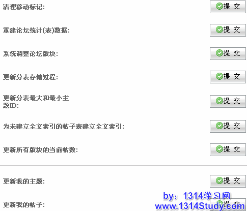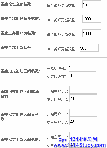 分隔线以下的项目功能和上边的项目一致,不过它可以设置更新的区间。例如只想更新FID(版块ID)为2-5的版块的帖数统计,那么我们可以在“开始板块FID”和“结束板块FID”中分别填写2和5。这样就不用每次都全部重新统计了。