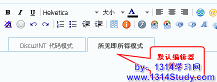 可选择默认编辑器为Discuz!NT代码模式或所见即所得模式。如下图所示: