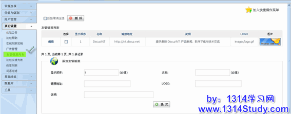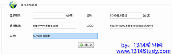然后到后台添加,方法如下图所示:“显示顺序”、“名称”、“链接地址”、“logo 地址”、“LOGO”、“说明”全部填写,然后“提交”即可。
