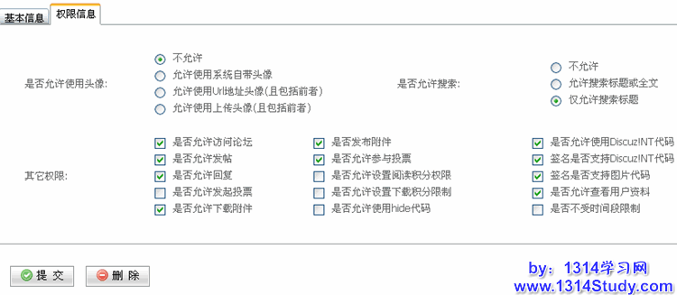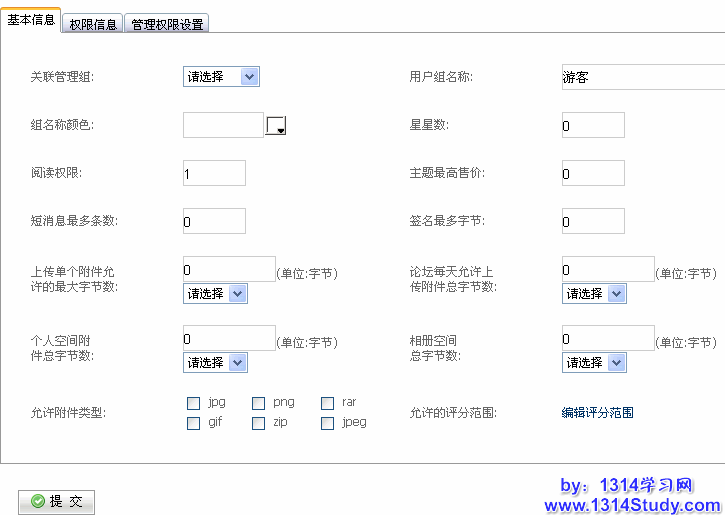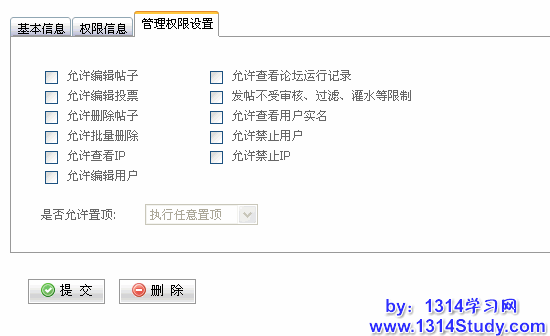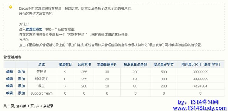 管理组的添加和编辑和积分用户组是一样的,唯一不同的是,管理组多了管理权限设置。