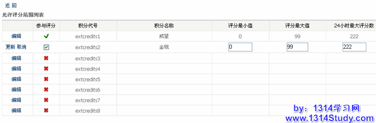 需要给该组的人评分的权限,可以点对应扩展积分前面的编辑,即进入输入状态,填写刻评分范围。