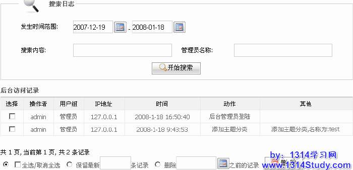 页面上部可以通过时间范围、内容和管理员名称进行模糊匹配搜索。页面下部是显示区和日志删除按钮。