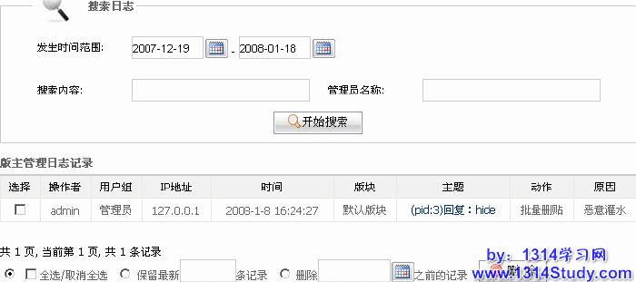 在这里主要是查看版主(也包括管理员的前台管理)操作的历史记录。版主的删贴、高亮、置顶等操作都会在这里记录下来,并且可以查看到操作的说明。如下图所示: