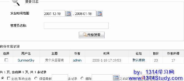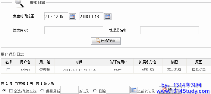 评分日志记录着在所有用户的评分记录,用户是否是在恶意评分或者版主评分是否不公正,都做到有据可查。操作类似后台日志部分。如下图所示: