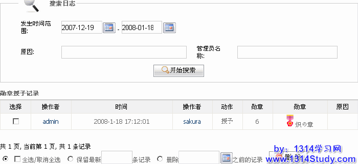 在这里主要是查看对会员授予勋章的历史记录。页面上部可以通过时间范围、授予原因和管理员名称进行模糊匹配搜索。页面下部是显示区和日志删除按钮。如下图所示: