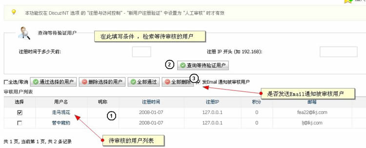 此处可以根据条件查询待审核用户,并且可以对“审核用户列表”中选定的用户进行 “通过审核”和“删除”等操作。