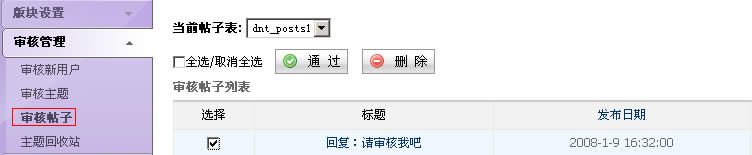 另外,图中“当前帖子表” 选择的是当前正在使用的帖子分表。而[审核帖子列表]中显示的则是该帖子分表中存在的需要审核的帖子。