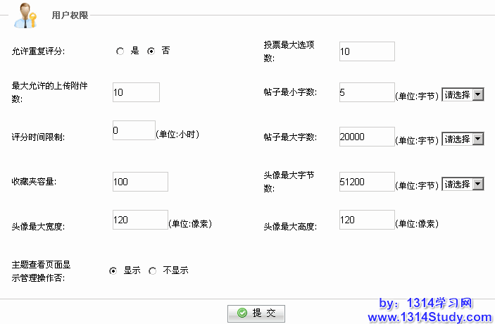 论坛选项的具体位置;请登陆系统后台 => 论坛 => 常规选项 => 用户权限,界面如下图所示: