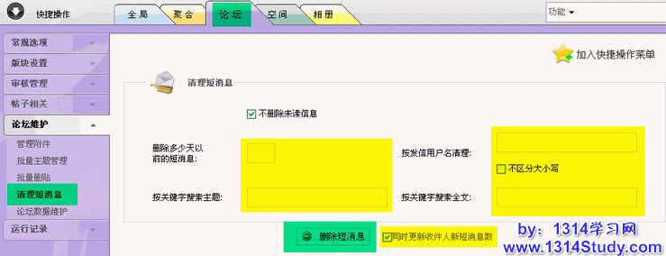 按发信用户名清理:设置要删除哪个会员的短消息;
