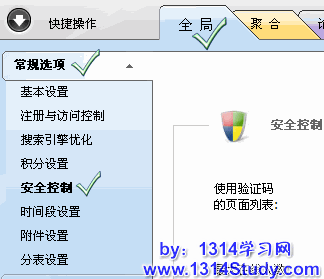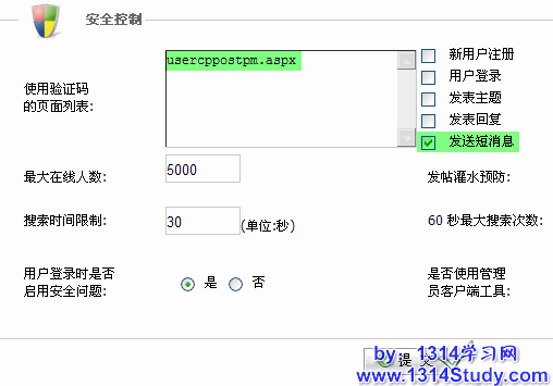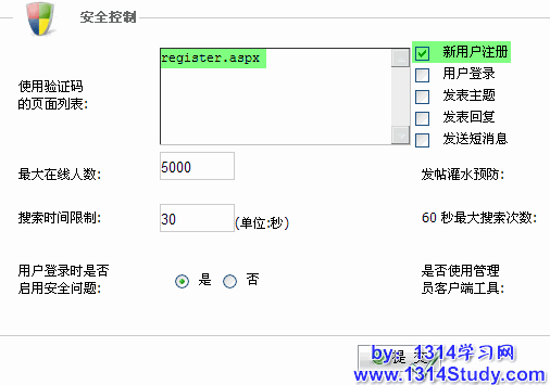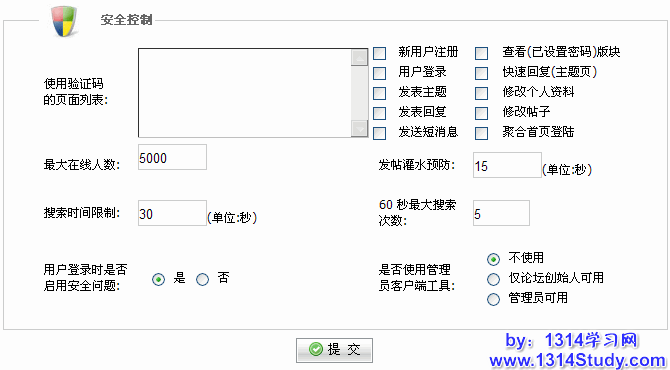 安全控制里主要对站点的功能和性能的一些优化,使得站点的运行更适合您当前情况的需求。比如启用验证码、发帖灌水预防以以及用户登录时是否启用安全问题,可以防止恶意灌水;最大在线人数、搜索时间限制、60 秒最大搜索次数等主要针对站点性能的优化。