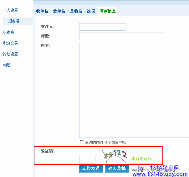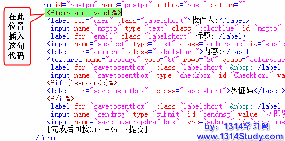 然后在相应页面模板表单中加入校验码子模板,“发送短消息”对于的模板文件为 \templates\default\usercppostpm.htm (以默认模板为例),我们如下图所示在
