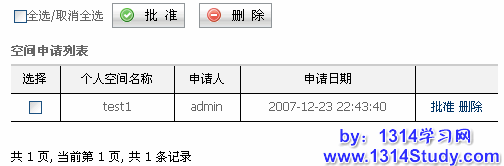 审核空间列表中可以看到最近用户申请的等待审核的空间,顶部的"全选/取消全选"选框可以批量批准或者删除用户的申请,或者也可以使用列表后部的批准和删除链接,进行个别的操作,当批准用户的申请后,用户就被允许使用个人空间了,当选择删除后,将忽略用户的本次申请。