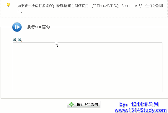 这里很简单了,只要把写好的 SQL 语句放到这里执行就可以。当然,SQL 语句都是包含特定功能的,所以您不是了解这个 SQL 是什么功能的话,不要随意的去执行一些 SQL。如果要一次运行多条 SQL 语句,语句之间请使用 --/* Discuz!NT SQL Separator */-- 进行分割即可。
