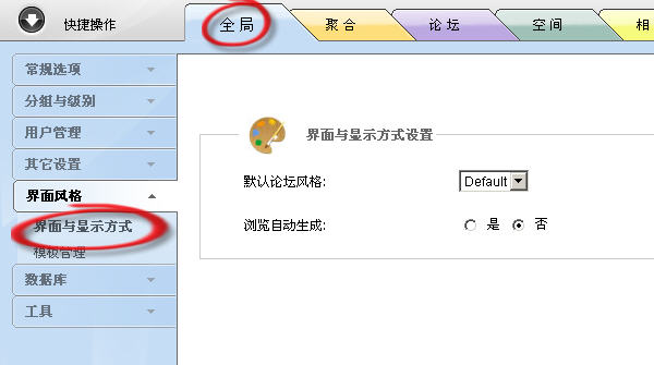 首先进入后台,来到“全局” => “界面风格” => “界面与显示方式”。如下图所示: