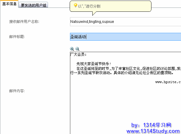如果是发给指定的几个用户,我们可以在“接收邮件用户名称”输入框中填写用户的论坛用户名。多个用户名之间请用英文的逗号“,”分割。