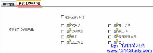 如果是给用户组批量发送电子邮件,我们需要切换到“要发送的用户组”标签。然后勾选需要发送邮件的用户组。如下图所示: