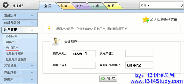有时需要将两个用户合并成一个用户。相册,照片,收藏,我的主题,我的帖子,照片评论,日志,日志评论,短消息,个人空间,日志分类,积分交易等项目将被合并。