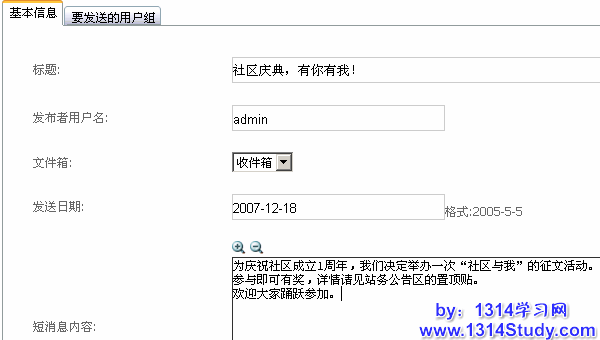 “标题”和“短消息内容”将作为主要内容发送到用户短消息信箱中。(标题和内容都支持HTML代码)