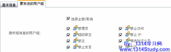切换到“要发送的用户组”,在这个选项卡下可以选择接收短消息的用户组,可以全选,也可以单独选择其中的一组或者几组。如下图所示: