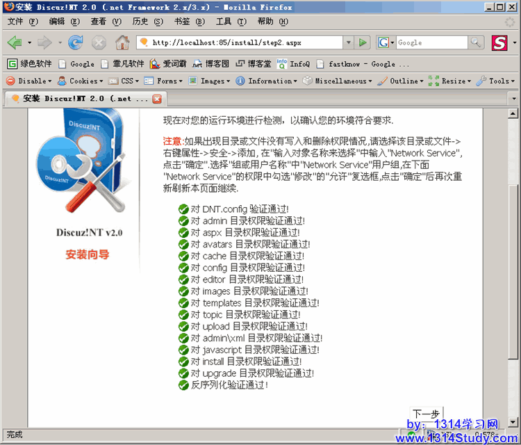 在浏览器地址栏输入类似 http://localhost/discuz/install/index.aspx 的地址,根据安装向导的提示 ,一步一步进行。(其中 discuz 是在 IIS 中建立的虚拟目录名)