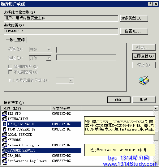 再点击[添加]按钮,此时弹出[选择用户或组]对话框,再依次点击[高级],[立即查找]按钮,在下面的搜索结果中 选择 IIS 来宾帐号,和 NETWORK SERVICE 帐号。确定后,把这两个帐号添加进来。