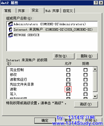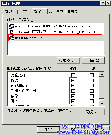 给 IIS 来宾帐号 "读"权限,给 NETWORK SERVICE 帐号 “读”“写”“修改” 权限。