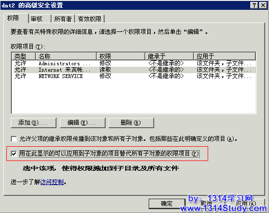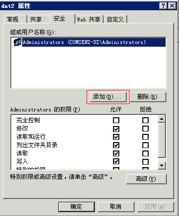 点击[高级]按钮,将权限应用到子目录及所有文件。