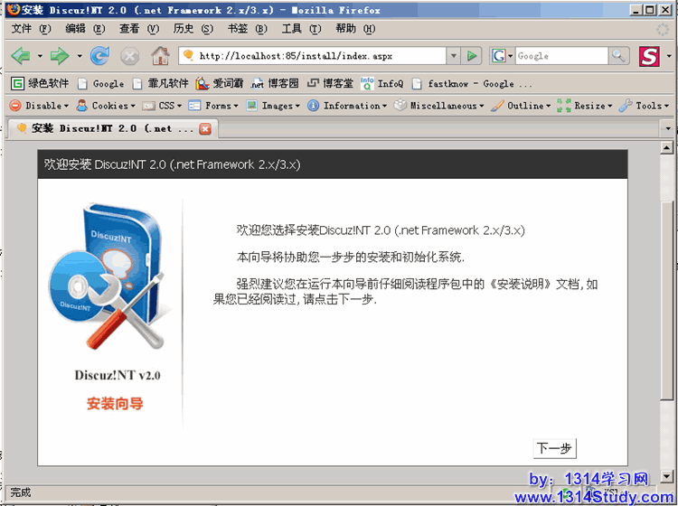 在浏览器地址栏输入类似 http://localhost:85/install/index.aspx 的地址,根据安装向导的提示 ,一步一步进行。(其中数字85是在 IIS 中建立站点的时候指定的端口号)