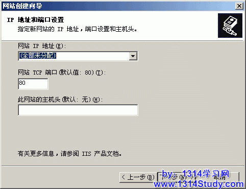 下一步后会提示您设置 IP 、端口、主机头等信息。前两项没有特殊要求的话可以使用默认设置,然后一路下一步直到完成。端口号不能和已有站点的端口号重复。