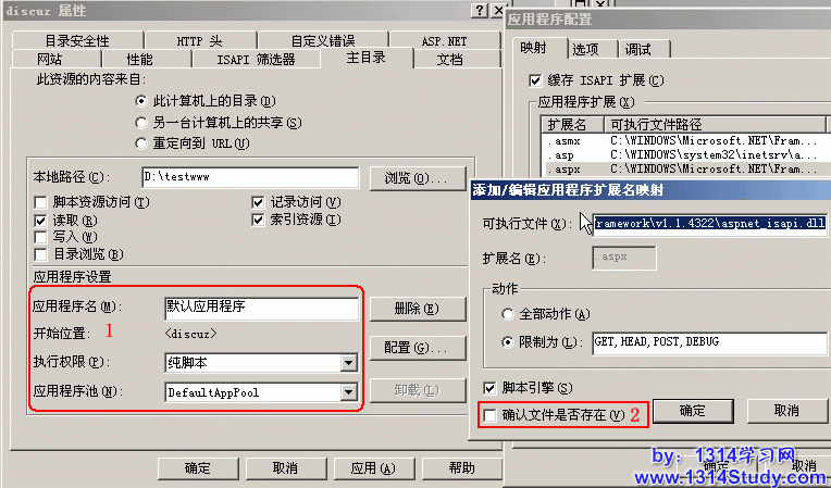 如果您同时安装了 .NET Framework 1.1 和 .NET Framework 2.0 可以在 IIS 的站点中的 ASP.NET 选项内选择和 Discuz!NT 程序相应的 asp.net 版本。