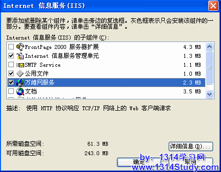 首先打开[开始]菜单,然后依次打开控制面板→添加或删除程序→添加/删除Windows组件,接着在Windows组件向导内找到 [Internet信息服务(IIS)] ,双击,按照下图所示选择对应的组件。