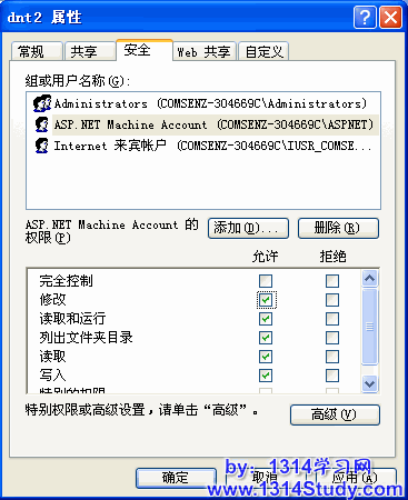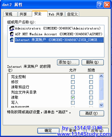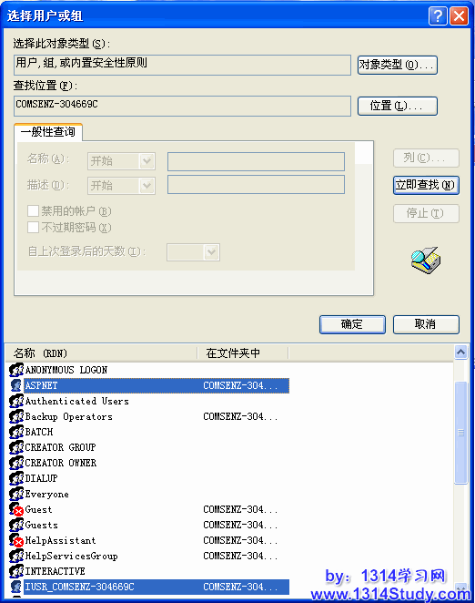 再点击[添加]按钮,此时弹出[选择用户或组]对话框,再依次点击[高级],[立即查找]按钮,在下面的搜索结果中 选择 IIS 来宾帐号(这里是 IUSR_COMSENZ-304669C ),和 ASPNET 帐号。确定后,把这两个帐号添加进来。
