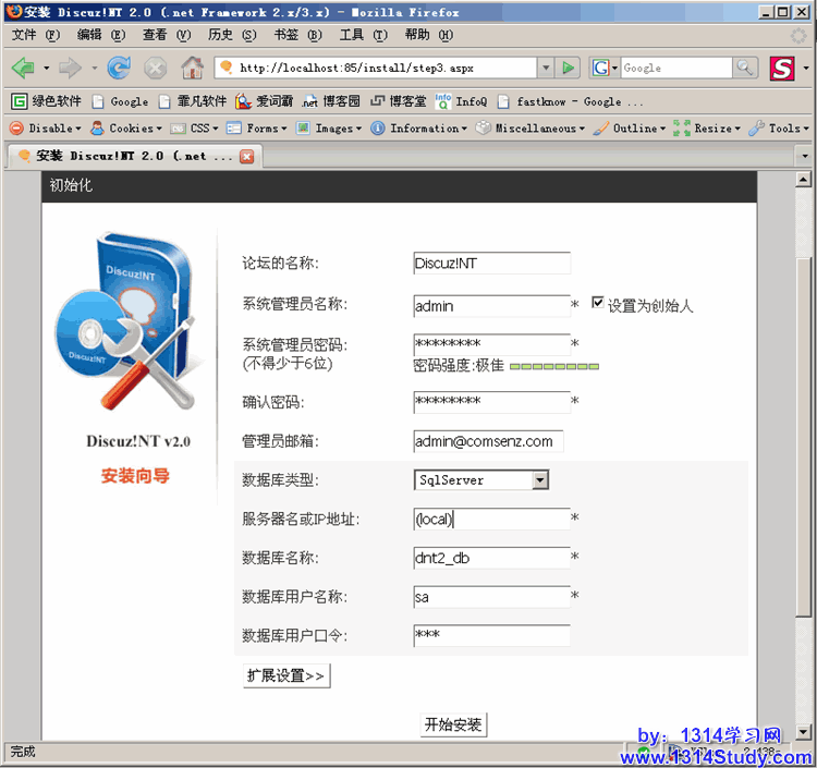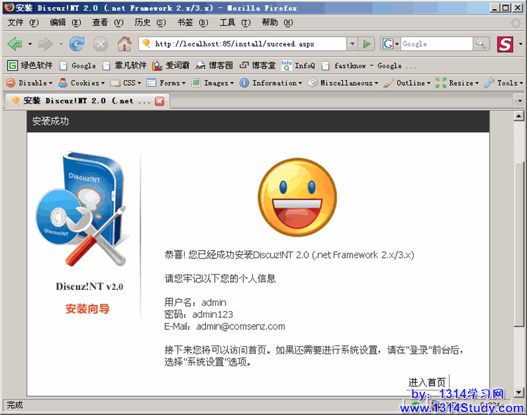 在浏览器地址栏输入类似 http://localhost/discuz/install/index.aspx 的地址,根据安装向导的提示 ,一步一步进行。(其中 discuz 是在 IIS 中建立的虚拟目录名)