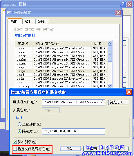 点击[配置]检查您的 ISAPI扩展, .aspx 文件无需确认文件存在。如果此选项已经选中请您取消该选项。具体设置可以参考下图。