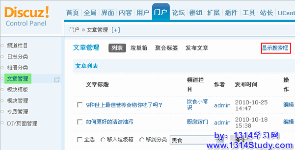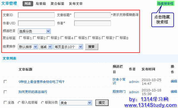 搜索文章:点击上图中的“显示搜索框”即可显示文章搜索框,这里可以根据文章ID、文章标题(支持模糊查询)、作者UID、作者(支持模糊查询)、文章分类、聚合标签和结果排序进行搜索。