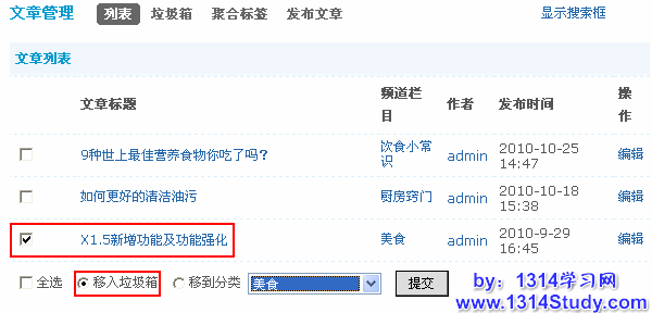 移入垃圾箱:把想要删除的文章移入垃圾箱,选择好要删除的文章,直接移动到垃圾箱即可,如下图所示: